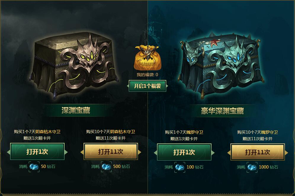 购买1个阴森枯木守卫(7天),赠送1个深渊宝藏,打开深渊宝藏可以获得英雄或皮肤奖励(99.5%),或惊喜福袋(0.5%)