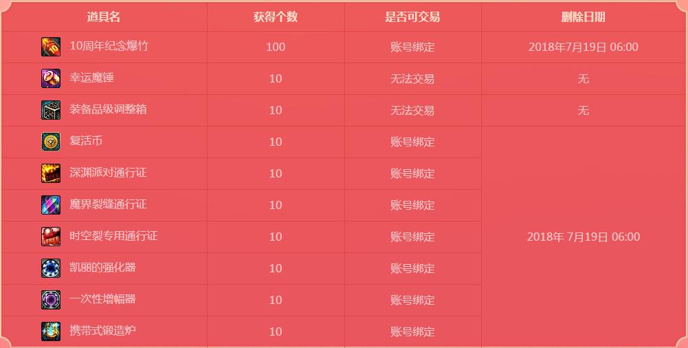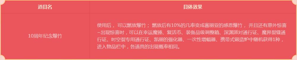 2、在【10周年纪念爆竹】中出现的道具与【十周年感恩礼包】礼包中的道具相同,也是帐号绑定,且都将于2018年7月19日6:00删除。