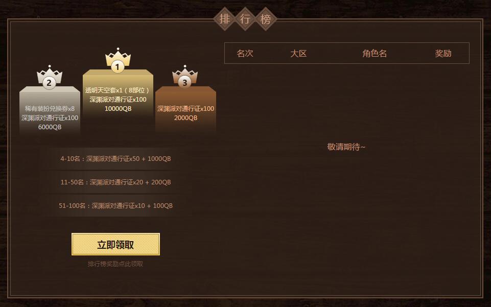4、顺利通过四位NPC的默契考验,即可参与默契排行榜抢位,默契排行榜将于6月25日晚19:00开启,玩家可点击排行榜下方的“立即领取”按钮进行抢位,前100名玩家将依据排名获得相应奖励。