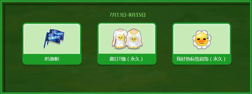 每天赠送10个【85旗帜】,只要挂上此旗帜,在19:00-21:00参加游戏,即有机会获得夏日T恤(永久),我好热标签肩饰(永久)等精彩奖励!