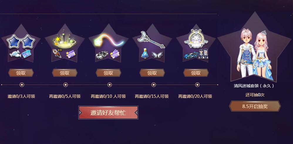邀请好友进入页面达到指定人数,即可点星成功获得奖励。每天最多可点一颗星。 每点亮一颗星可获得一次抽取心愿奖励的机会!