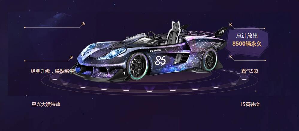 8月5日15点在线即可获得A车【星际传说】(30天),概率获得永久赛车!使用保养卡可以将天数的赛车变为永久哦!