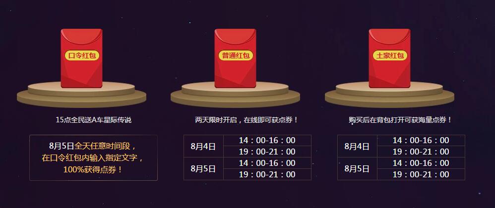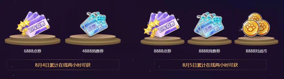 8月4日-8月5日,14-16点累计在线满2小时,即可获得8888点券+消费券+对战币!
