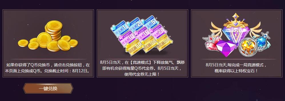 8月5日全天24小时,在【竞速模式】释放氮气、飘移即有机会获得海量Q币代金券。本次活动除了代金券外,在竞速模式下完成比赛,还有机会获得Q币、贵族特权等豪华奖励!