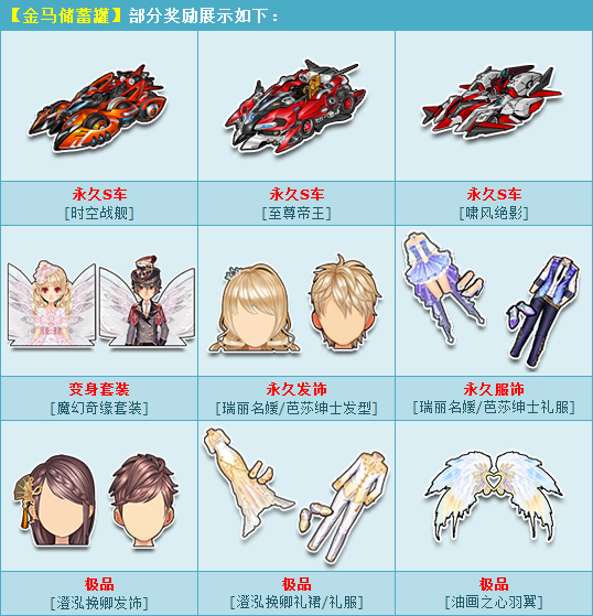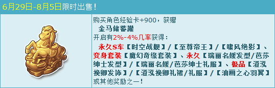 活动期间,购买角色经验卡+900,获赠:金马储蓄罐,开启有机会获得:永久S车【时空战舰】/【至尊帝王】/【啸风绝影】、变身套装【魔幻奇缘套装】、永久【瑞丽名媛发型/芭莎绅士发型】/【瑞丽名媛/芭莎绅士礼服】、极品【澄泓挽卿发饰】/【澄泓挽卿礼裙/礼服】/【油画之心羽翼】或其他奖励之一!