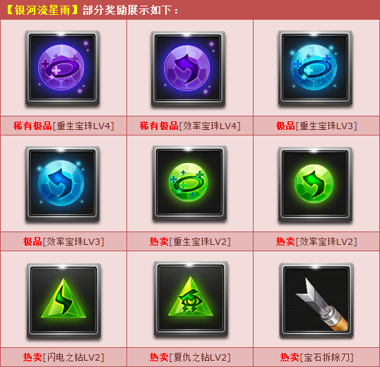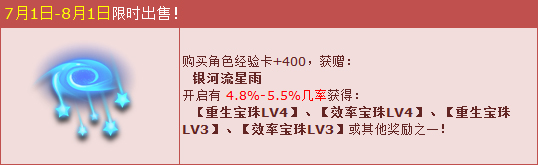 活动期间,购买角色经验卡+400,获赠银河流星雨,开启有4.8%-5.5%几率获得:【重生宝珠LV4】、【效率宝珠LV4】、【重生宝珠LV3】、【效率宝珠LV3】或其他奖励之一!