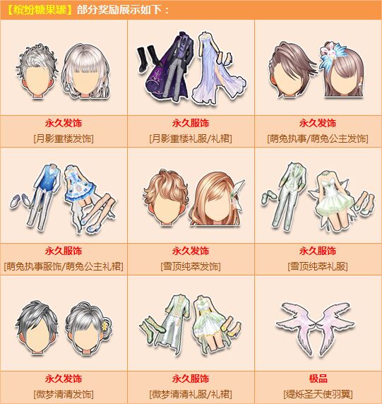 活动期间,购【角色经验卡+300】,赠送【缤纷糖果罐】,有机会得永久【月影重楼发饰】/【月影重楼礼服/礼裙】/【萌兔公主/萌兔执事发饰】/【萌兔执事服饰/萌兔公主礼裙】/【雪顶纯萃发饰】/【雪顶纯萃礼服】/【微梦清清发饰】/【微梦清清礼服/礼裙】或其他奖励之一!