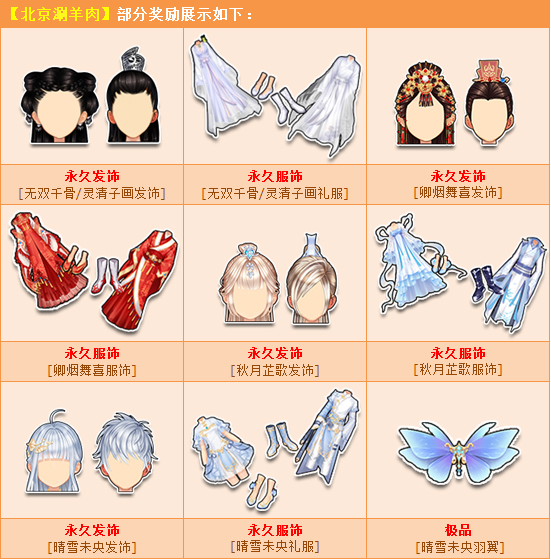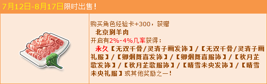 活动期间,购买角色经验卡+300,获赠:北京涮羊肉,开启有2%-4%几率获得:永久【无双千骨/灵清子画发饰】/【无双千骨/灵清子画礼服】/【卿烟舞喜发饰】/【卿烟舞喜服饰】/【秋月芷歌发饰】/【秋月芷歌服饰】/【晴雪未央发饰】/【晴雪未央礼服】或其他奖励之一!