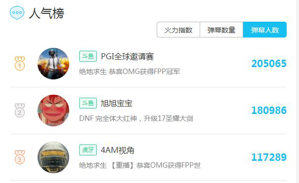 以7月30日凌晨OMG夺冠的PGI全球邀请赛决赛直播为例,斗鱼直播间以20万的弹幕数位居全平台榜首,是其他平台的近两倍。