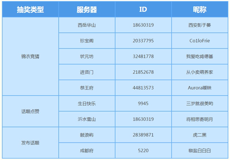 活动已经结束,恭喜以下9名玩家获得“云龙梦”七夕礼盒免单奖励,获奖玩家购买七夕礼盒后,将获得消耗的3600点游戏点数返还。