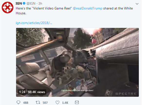 随后,这位爱搞事情的总统先生,就搞了一次暴力游戏展示会。在播放的演示视频中,《使命召唤》、《德军总部》、《辐射4》、《狙击精英》等众多射击游戏赫然在列不说,特朗普还在视频播放完毕后,意味深长地补了一句:“这是暴力吧,不是吗?”