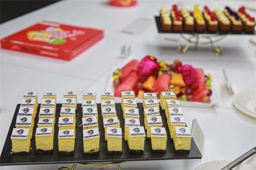 接下来就是大家也相当期待的冷餐会时间,橙汁、披萨、糕点、水果等美食应有尽有,为奔波了一整天行程的队员们与粉丝们带来绝佳的能量补给。其中最受欢迎的还是印有上海龙之队 LOGO 的定制小蛋糕,不仅造型精美,粉丝也大赞味道非常可口!