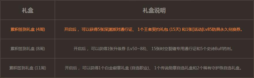 活动期间,累积签到4、8、11次可以获得累积签到礼盒。活动期间可以额外通关40次推荐地下城补签2次。