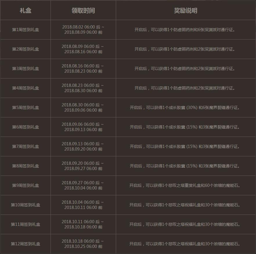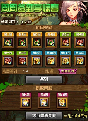 活动期间,每个帐号每周可获得一次签到机会,一周中累计通关4次推荐地下城后点击活动窗口的【签到】按钮即可获得每周的签到奖励!
