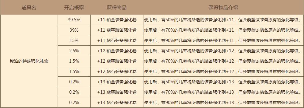 温馨提示:本次加入的希泊的特殊强化礼盒获取概率为0.25%。