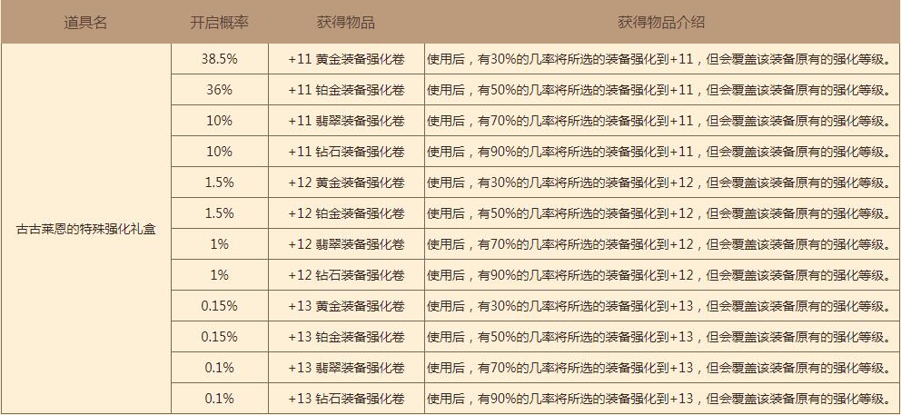 温馨提示:本次加入的古古莱恩的特殊强化礼盒获得概率为0.5%。