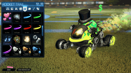 更加可贵的是《火箭联盟》的每一个物品都有着相当用心的设计,大到形态各异的车辆,小到玩家的名牌,尤其是车尾的喷射效果,每一种都有着精细的动画和独特的音效,即便是那些并非很稀有的喷射效果。就比如有一种稀有度很普通的喷射,是能够让你一路撒出纸币,「为所欲为」的。