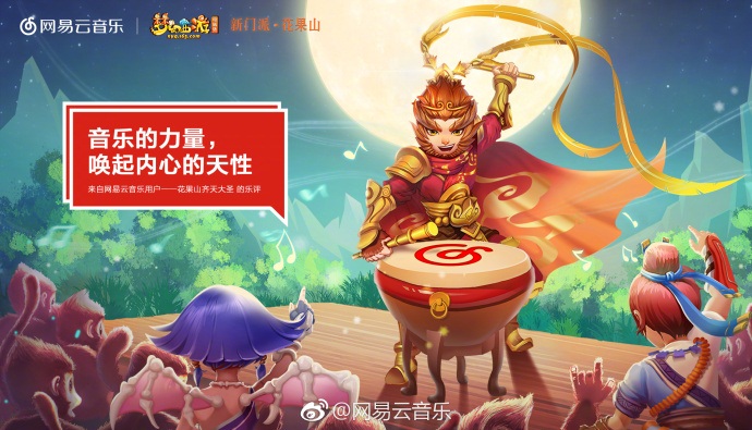 @网易云音乐 让齐天大圣变身用户,用“音乐的力量,唤起内心的天性”。不知多少80后、90后在提到齐天大圣时耳边会自动响起“猴哥猴哥,你真了不得”的BGM?