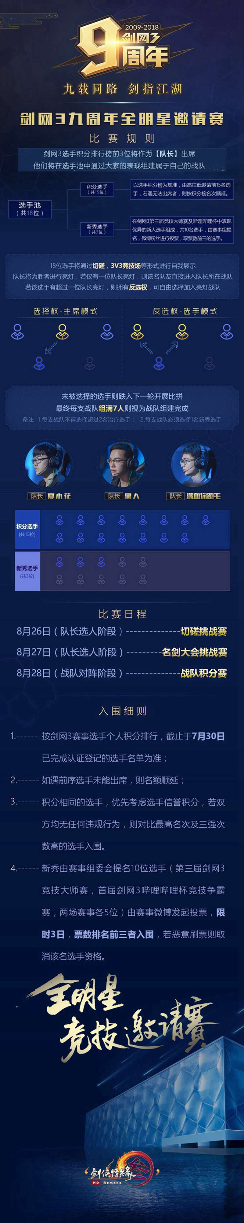 除了诸多嘉年华的精彩活动外,侠士们期待已久的《剑网3》全明星竞技邀请赛即将来袭!与以往的竞技赛事不同,本次全明星竞技邀请赛加入了全新的队长选人机制,积分榜最高的三位选手夏小花,黑人,满血你跑毛将担任本次竞技赛队长,依次从积分榜邀请15位积分战将以及三位黑马新秀中选取队员,并参与到本次的《剑网3》全明星竞级邀请赛当中。两位S级解说半小蛮,伍贰君与A级解说赤鳞将前往嘉年华现场进行解说。除此之外,还有高颜值记者团队:轩此汐,丢小檬,珠宝现场直击,为侠士们呈现精彩赛事与台前幕后花絮!