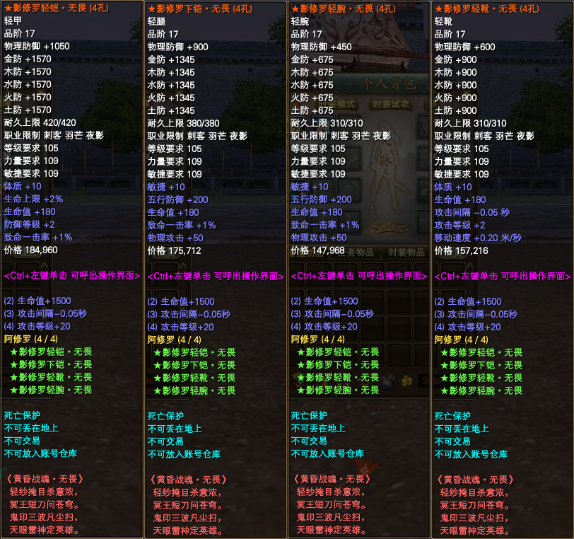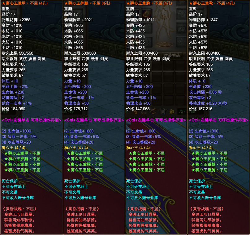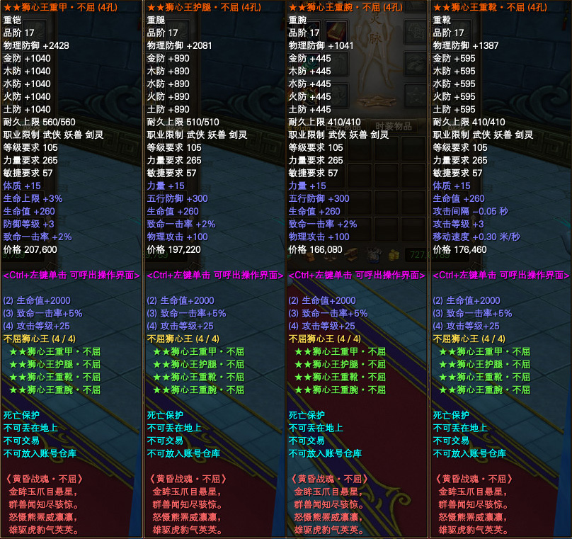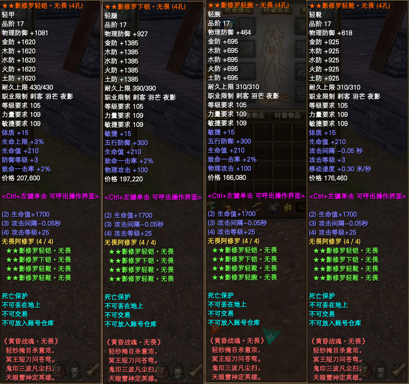 十七品防具根据职业的战斗特性,分为重甲、轻甲、法甲三种。同时十七品防具拥有三大成长阶段,等阶越高,防具的基础属性及激活的套装属性则越强,勇士通过不断收集铸造材料,可以将拥有的十七防具逐步升级,直至最高等阶。十七品防具的基础属性固定,但这并不影响其在威力榜单中跻身榜首,因为更强大的威力正蕴含其中,等待勇士们的发现。