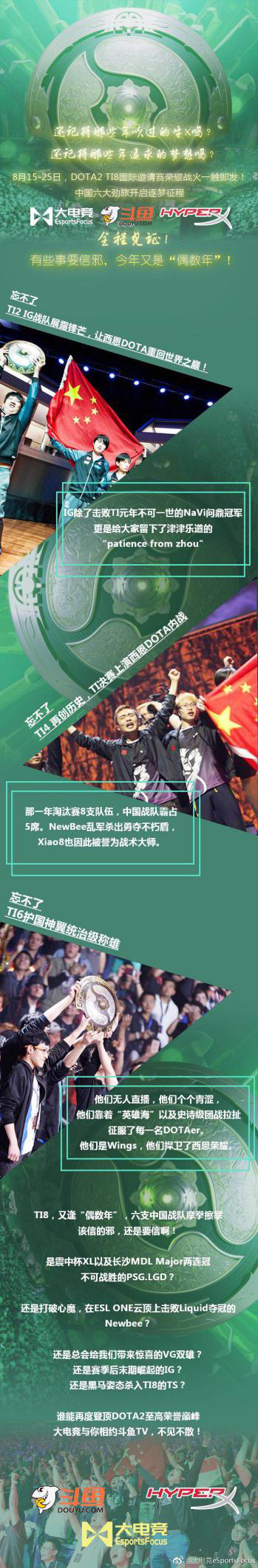 DOTA2年度顶级电竞赛事TI8全球邀请赛今天就要拉开帷幕,国内外18支战队将在温哥华展开激烈角逐,争夺巅峰荣誉。CN DOTA今年有6只队伍征战,分别是PSG.LGD、VG、Newbee、VGJ.T、Serenity和IG,其中LGD,VG,Newbee,VGJ.T四支队伍是受邀参战,serenity和TG是预选赛出线的。值得一提的是,今年7月斗鱼先后成为VG和LGD的顶级赞助商,助力他们在TI8夺冠。赛后两只战队的队员还会在斗鱼直播游戏,DOTA2的粉丝将有眼福在斗鱼平台观看顶级选手的战斗场面。
