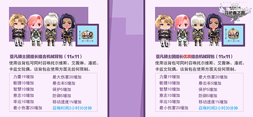 跟随本次更新一起上线的新商品必定是米莱西安一直期盼着的《亚凡骑士团机械背包礼包》了,迈着可爱的小短腿,不停四处奔跑帮米莱西安捡拾金币、皮革等等实用道具的呆萌小人偶大家一定非常熟悉了,本次更新的机械背包将比原有的机械背包空间更大,包裹被占地更小,召唤人偶之后加成的属性更多哟,大家千万不要错过了!