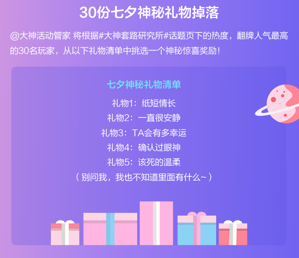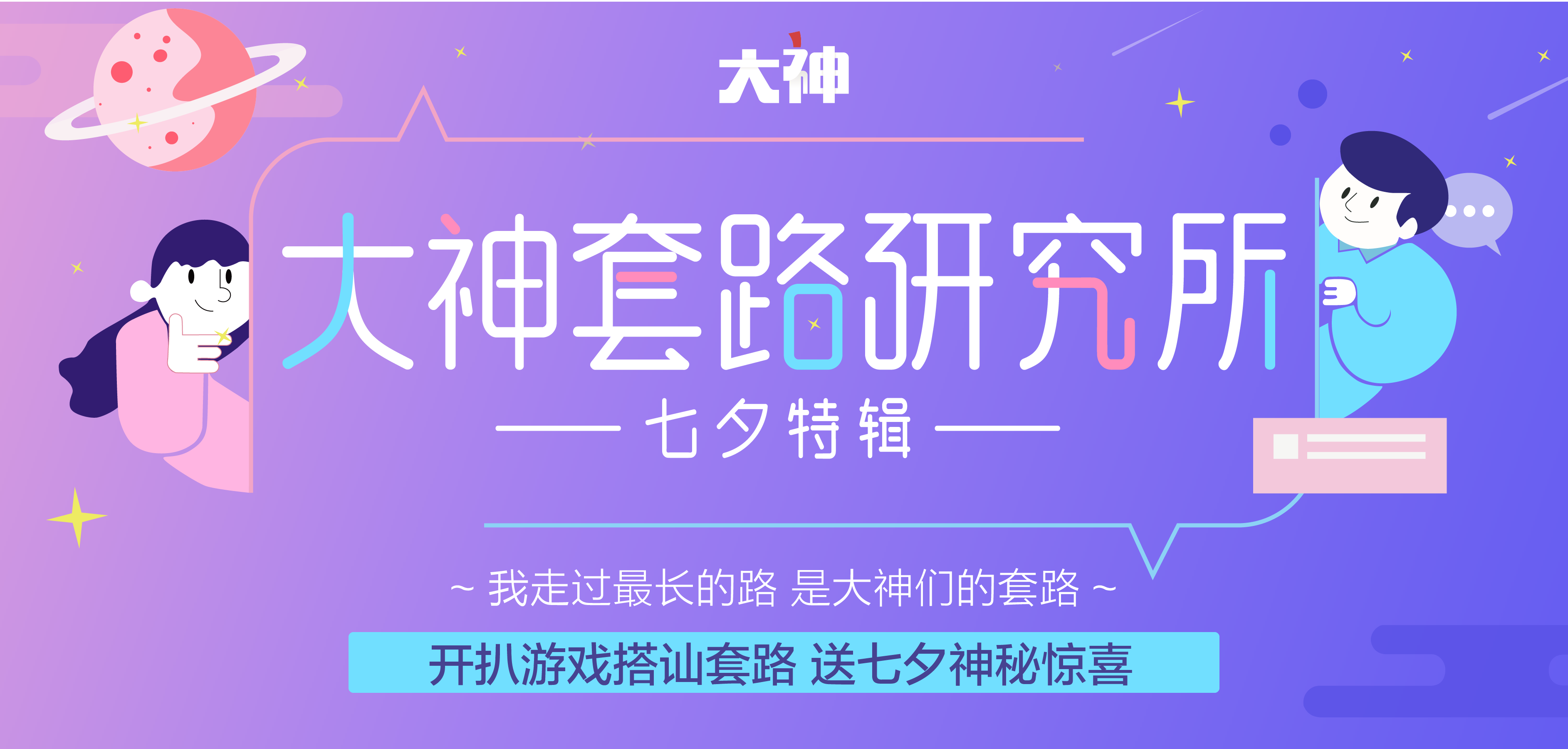 8月20日,@大神活动管家 将根据#大神套路研究所#话题页下的热度,评选出人气最高的30名玩家送出七夕奖励!《纸短情长》、《一直很安静》、《该死的温柔》等以歌名为谜面的奖品暗藏玄机,甜蜜和魔性兼具,等你来pick!