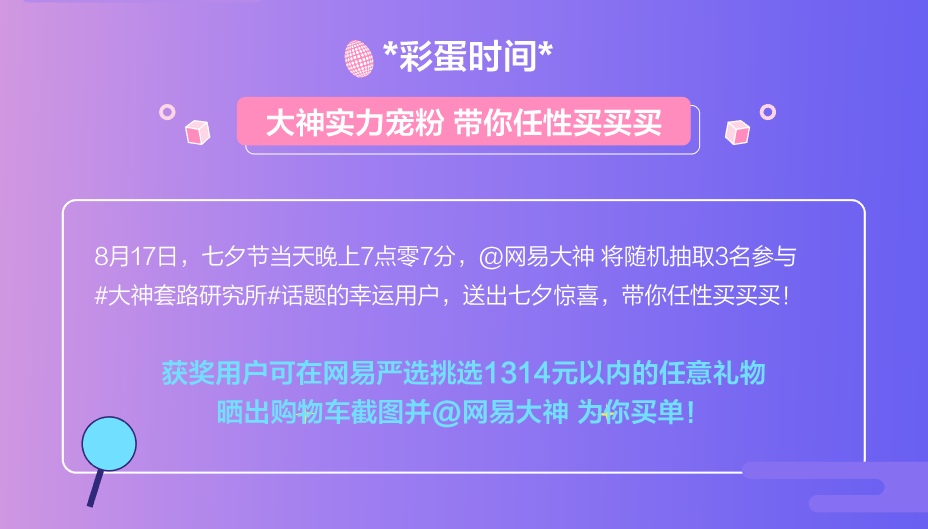 七夕惊喜福利随机掉落!8月17日,网易大神将随机抽取3名成功参与话题互动的玩家,送出1314元七夕严选购物津贴。获奖的幸运儿只需晒出你的购物车,即可获得由网易大神为你买单的七夕礼物!