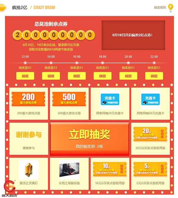 “疯抢2亿”可以说是网游节中的重磅环节,玩家们只要在18、19号的各个时间段准时登录活动页面即可领取“818网游节抽奖券”并参与抽奖,除了各种稀有道具和游戏周边外,还有2亿游戏点券和各种抵用券等待着玩家们前来瓜分。