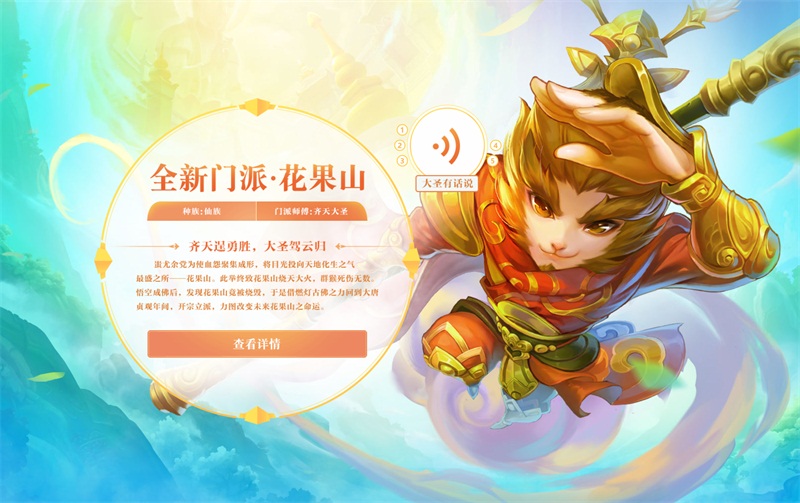 《梦幻西游》电脑版全新仙族门派花果山,现在已经正式降临三界。作为齐天大圣孙悟空的门徒,花果山弟子既具备斗战胜佛的勇猛,也继承了灵猴的顽皮心性。这也使花果山弟子在战斗时,需要在随机出现的如意神通中选择适合自己的技能去克敌制胜。相信这个强调随机应变,天生勇猛好战的门派,一定能给诸位玩家以全新的游戏感受!