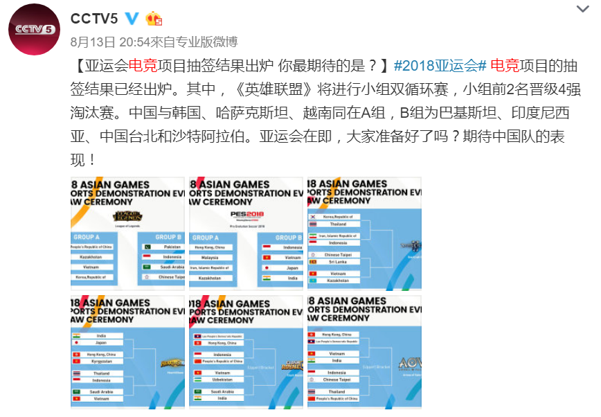 北京时间8月18日20:00,2018年印尼雅加达亚运会正式拉开了帷幕。中国体育代表团首日即获得了7金5银4铜,取得了总奖牌16枚位于亚运会奖牌榜第一名的好成绩,笑傲雅加达!就在今天上午,中国选手杨皓然10米气步枪卫冕夺冠,实现了中国军团在这个项目上的7连冠!而亚运会电竞表演项目的比赛时间则在8月26日至9月1日,中国团队参加的三个项目分别为《英雄联盟》、《王者荣耀国际版(AoV)》、《皇室战争》,令人惊喜的是CCTV5官方微博也发布了亚运会电竞抽签结果。