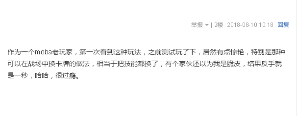 对于游戏的核心“卡牌MOBA”玩法,不少玩家给了“很颠覆”的评价,并且认为游戏很巧妙的将卡牌融合进传统MOBA玩法中,不但保持了MOBA游戏的超高竞技性,而且还用卡牌带来了创新变化,用对战时的卡牌调换达成“英雄职业”的更换,这在传统MOBA游戏中是很难见到的。