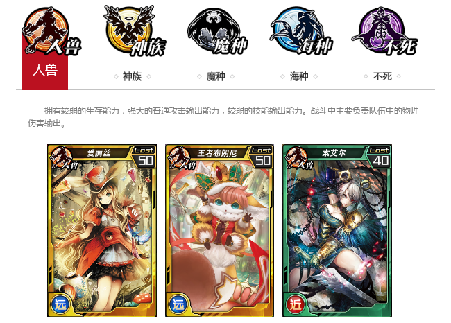 这些能实体出战的卡牌使魔,就是玩家对战时的左膀右臂,她们来自游戏中的人兽、神族、魔种、海种、不死5大种族,在一主动与一被动技能的设定下,每个种族都有自己的种族属性,或是肉盾,或是强力输出者,不同卡牌使魔组建的卡组将演绎完全不同的作战风格,并且在战场中只要卡组前五张为同一种族时就会激活种族特性,获得强大的BUFF加成。