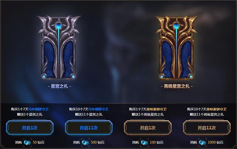 购买1个7天马年铜锣守卫,赠送1个星宫之礼,打开后可获得英雄或皮肤奖励(概率99%),或礼盒(概率1%)