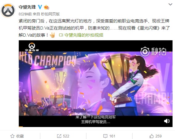 官方原文:紧闭的房门后,在这远离聚光灯的地方,深受喜爱的前职业电竞选手、现役王牌机甲驾驶员D.Va正在测试她的机甲,防患未知的……现在观看《星光闪耀》来了解D.Va的故事!