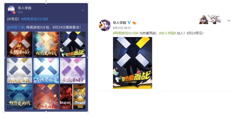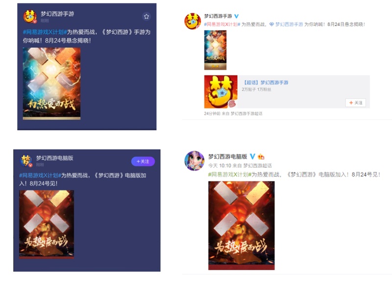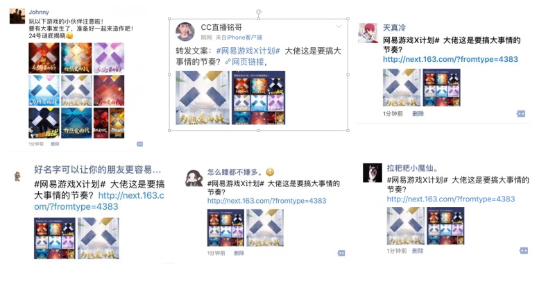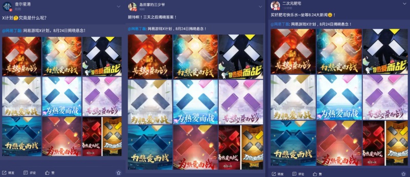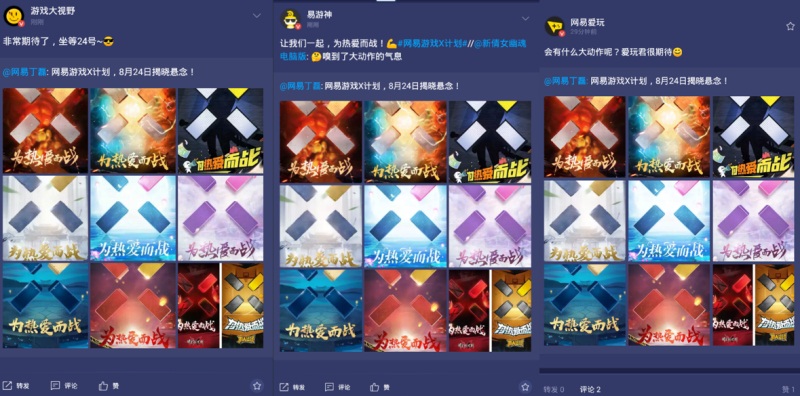 从网易大神,到十款网易游戏联合发声,再到众多KOL,乃至各大游戏社媒……这个神秘的“X“标志,以及那九张镶嵌着”X”标志的海报,竟在短短一天不到的时间内,迅速渗透到了你我身边。