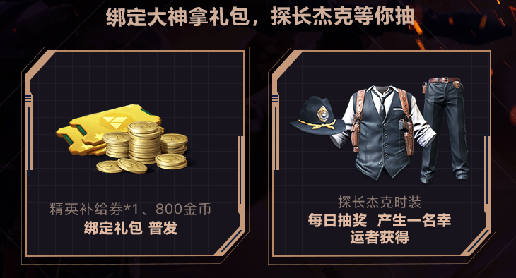 绑定抽大奖。8月23日起,下载网易大神并绑定《终结者2》游戏角色,即可获得精英补给券及金币奖励。活动期间还将在每日绑定的玩家中抽取一位送出珍贵套装——探长杰克!