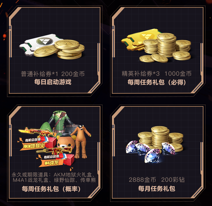 玩转福利中心任性领好礼!每日从网易大神启动游戏即可获得金币。此外,在福利中心完成每日签到及每周签到任务还可以额外获得礼包奖励!除了补给券和金币外,还有机会获得枪械皮肤礼盒、永久时装“绿野仙踪”、“传单熊”!