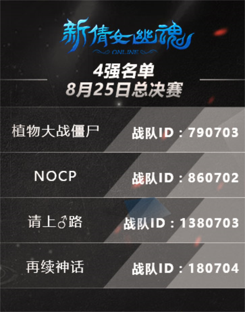 过五关斩六将,奋勇杀敌,《新倩女幽魂》2018全民争霸赛4强战队已诞生——请上♂路、再续神话、NOCP、植物大战僵尸,向全国总冠军之位发起冲击。总决赛将在8月25日倩女幽魂嘉年华现场展开,最后的大战一触即发,50W现金大奖将如何瓜分?高手过招,让我们拭目以待!