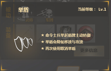 使用该技能后命令士兵主动举起盾牌防御,在举盾状态下会降低移速和攻速,再次使用该技能将取消举盾状态。