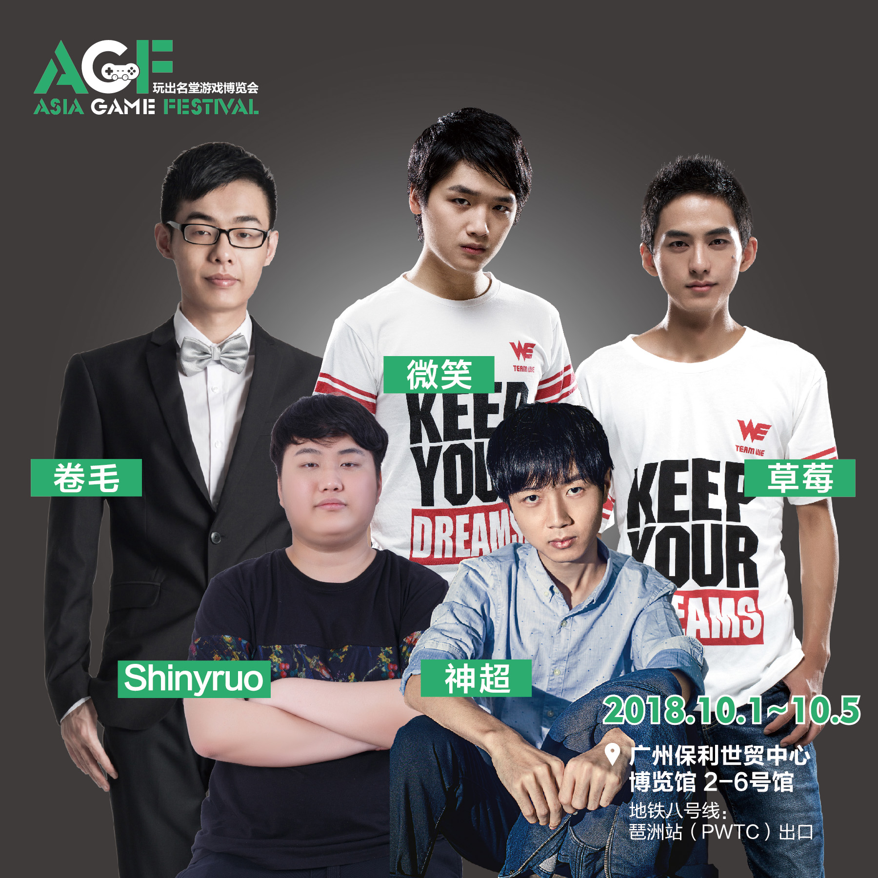 大家是否还想一睹他们的风采呢?现如今,这几个不服输的“老顽童”,将首次合体参加今年国庆在广州举办的AGF玩出名堂游戏博览会!今年国庆,他们将空降广州!微笑、草莓、神超、卷毛和Shinyruo,10月1日在AGF电竞舞台,约定你!