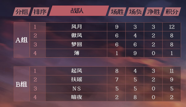 8月26日,通过10个比赛日的激烈对决,A组风月战队,B组起风战队凭借战队积分的优势提前锁定小组第一的出线名额,率先抢得季后赛两席。