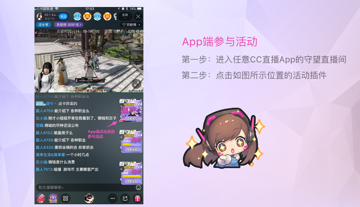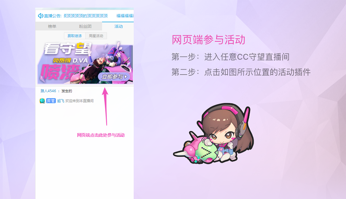 参与方式:在活动期间,用户成功登录【直播平台账号】并绑定【战网账号】后,前往CC直播“守望先锋频道”观看直播。
