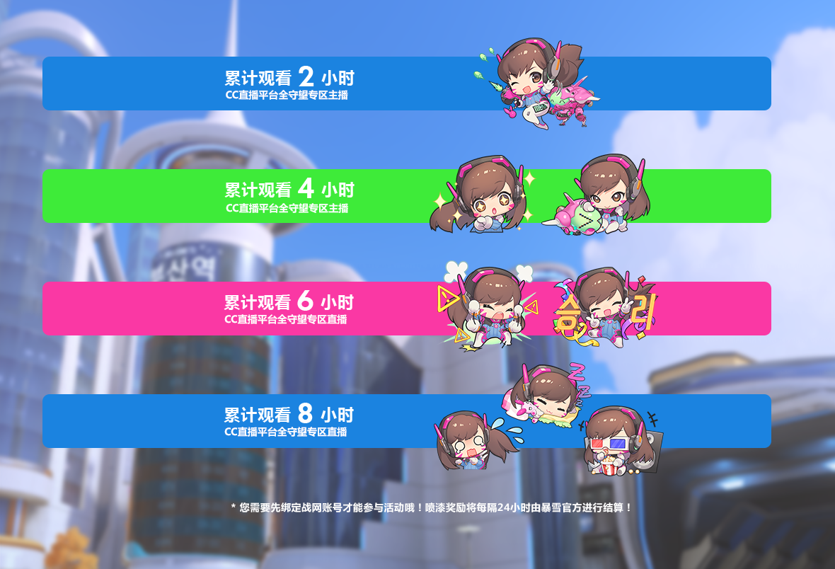 为方便用户更快获得免费领取D.VA限量版喷漆的机会,用户在守望频道观看直播的时长可进行累计使用。如:用户在A直播间收看了0.5小时,又在B直播间收看了1.5小时,则观看时长累计为2小时,即可免费领取1款D.VA限量版喷漆。
