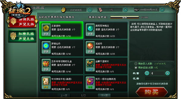 玩家在《征途2》中州新世界中完成氏族需求,可获得氏族声望增长,同时可以获得氏族勋章。根据不同的档次,可以用氏族勋章兑换氏族专有道具提升自身实力!每个氏族都有氏族兑换商店,可以在商店中兑换各种珍稀道具大礼,让你在激战、畅玩新世界的同时,赢取更多回报!