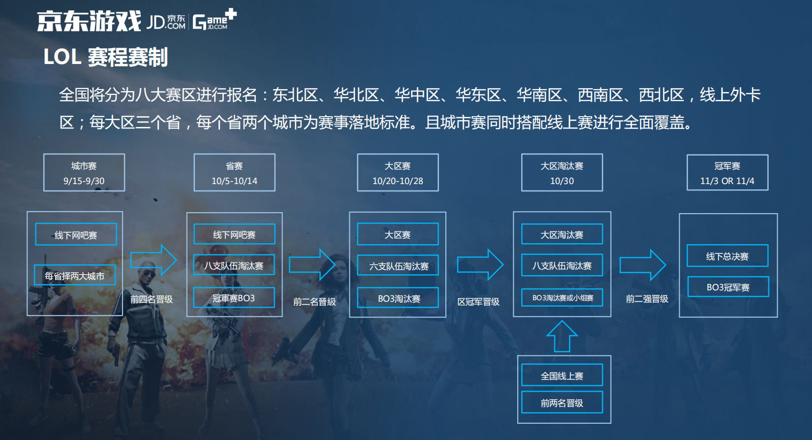 本届京东杯电子竞技大赛S2是2018年下半年最令人期待的非职业电竞赛事之一。本次大赛,共覆盖八大赛区,二十四个省。城市赛同时搭配线上赛进行全面覆盖,线上赛事的前两名将直接参与到大区淘汰赛,与各路豪强向着总决赛的舞台发起冲击。9月15日-9月30日将在全国范围内进行网吧城市预选赛,获胜的战队将晋级到省赛及大区赛。大区赛的各支晋级战队将于10月30日与线上赛的两支晋级战队一起,在总决赛中一决雌雄!