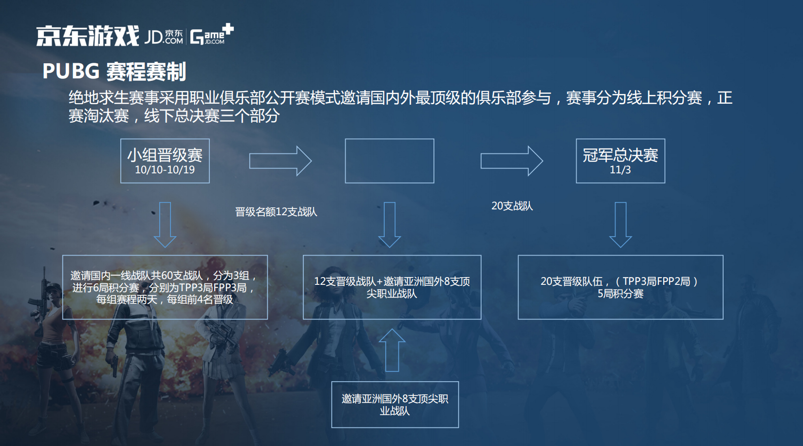 本届京东杯除了有最具代表性的moba游戏《英雄联盟》,时下最火热的射击游戏《绝地求生》也是本届赛事的另一个重要比赛项目。随着PGI全球邀请赛的举办,以及OMG斩获FPP全球总冠军,PUBG的赛事已经成为电竞赛事舞台的强力新军!赛事的关注度一路拔高,本届京东杯同样采用职业俱乐部公开赛模式,将邀请国内最顶尖一线战队,共计60支队伍,分为3组, 在10月17日到10月26日期间进行6局积分赛,分别为TPP模式3局FPP模式3局,每组赛程两天,每组的前4名将晋级。值得一提的是,本届京东杯绝地求生邀请赛,除了有国内顶尖队伍展开竞争激烈的小组积分赛之外,还将在总决赛邀请国外8支顶尖职业战队参加!届时,中外豪强共计20支顶尖职业俱乐部将共同角逐总决赛的舞台,带来一场规模宏大的PUBG专业赛事盛宴!