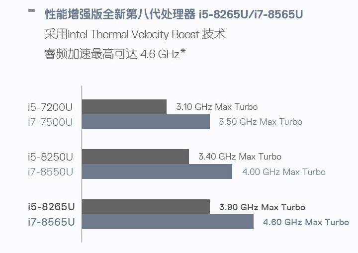 不久前英特尔正式推出全新性能增强版移动低压处理器:i3-8145U、i5-8265U和i7-8565U,代号Whiskey Lake,三款新品仍然属于8代酷睿系列,制程方面由Kaby Lake-R的14nm+变成了和其他八代处理器一样的14nm++。规格方面,i5-8265U和i7-8565U仍为四核八线程的设计,TDP仍是15W,核芯显卡也同样是UHD 620。相对于i5-8250U和i7-8550U的提升,主要在于睿频频率上:i5-8265U的单核、四核最大睿频分别为3.9GHz、3.7GHz,相比i5-8250U分别提升了0.5GHz和0.3GHz,这一规格已经几乎持平i7-8550U。而i7-8565U的标称规格更加“吓人”,单核睿频来到了4.6GHz,四核最大睿频也有4.1GHz,是目前主频最高的低压处理器之一。