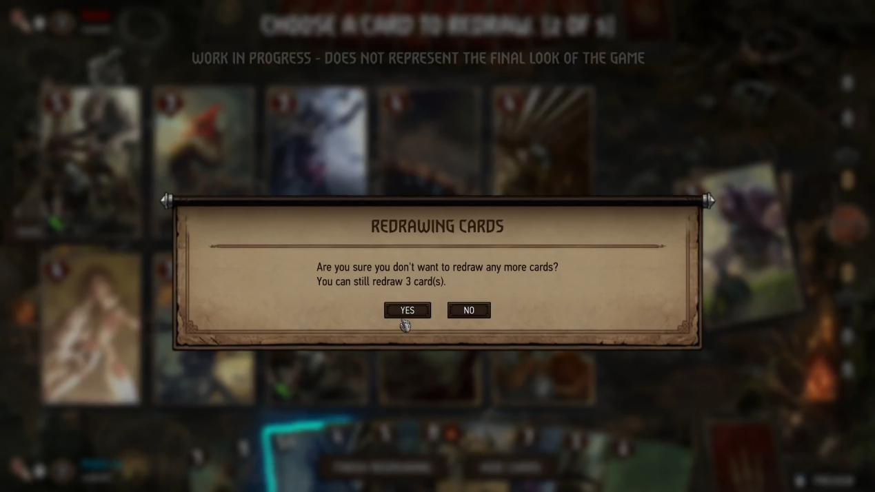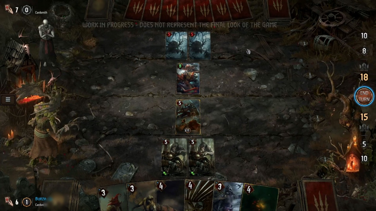 最后由于牌库限制系统的引入,你的牌库中的卡牌数量会受到限制,牌库只能由30张卡牌构筑。在这个系统下,我们去掉了效果同金色牌效果大同小异的银色牌——这将回归到《巫师3》的设计,它的昆特牌游戏中就只有铜色牌和金色牌。