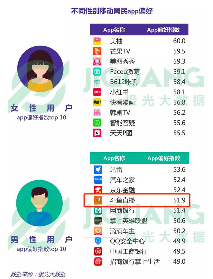 除了得到官方赛事的认可之外,各大移动数据统计榜单也可以看到斗鱼直播的身影。极光大数据于近日发布了《2018年Q2移动互联网行业数据研究报告》,报告显示斗鱼直播成为唯一上榜移动网民APP偏好TOP10的直播APP,且高居第四位。